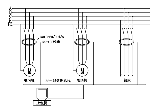 監測主機負責與智能漏電檢測互感器實時數據的采集和顯示,并且漏電監測主機將數據上送到上位機,三方組成通訊網絡系統,上位機實時顯示漏電數據及歷史數據并記錄。