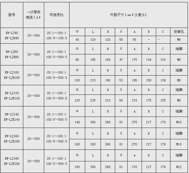 備注:可根據用戶需求定制φ40,φ260,φ300,φ350等口徑的零序電流互感器。